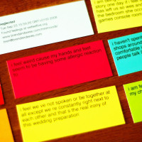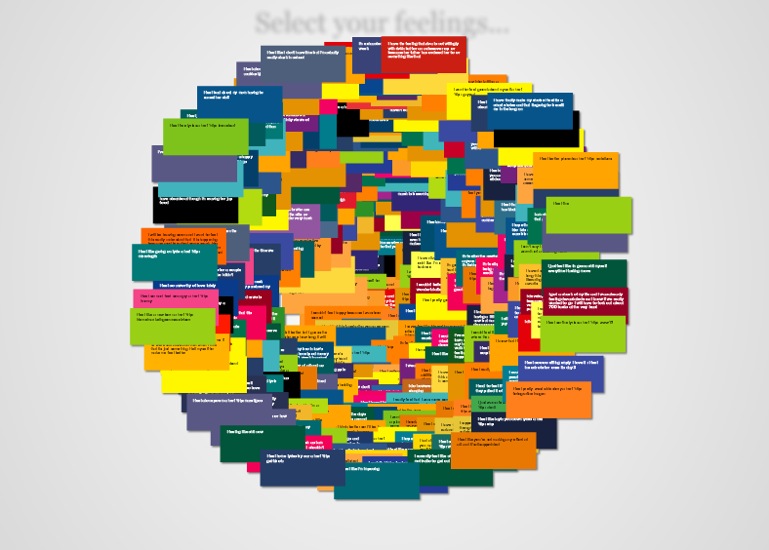 Inspired by the wonderful We Feel Fine, 100 Feelings Felt allows you to select a date whereupon 100 feelings—captured from across the web via the We Feel Fine API—are shown on screen. The system then allows you to select some or all of the feelings and then receive them as printed mini Moo cards, so you can keep them forever rather than simply existing as temporary bits of data.