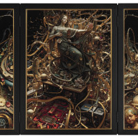 Altarpiece: The Divinity draws inspiration from a legendary game of Go, where AlphaGo, DeepMind's groundbreaking AI, defeated world champion Lee Sedol. The pivotal "Divine Move", move 37, marked a turning point in the match and is celebrated as an instance of profound creativity and unexpected brilliance. This moment, emblematic of the evolving interplay between human ingenuity and artificial intelligence, anchors Dawes' thought-provoking work.