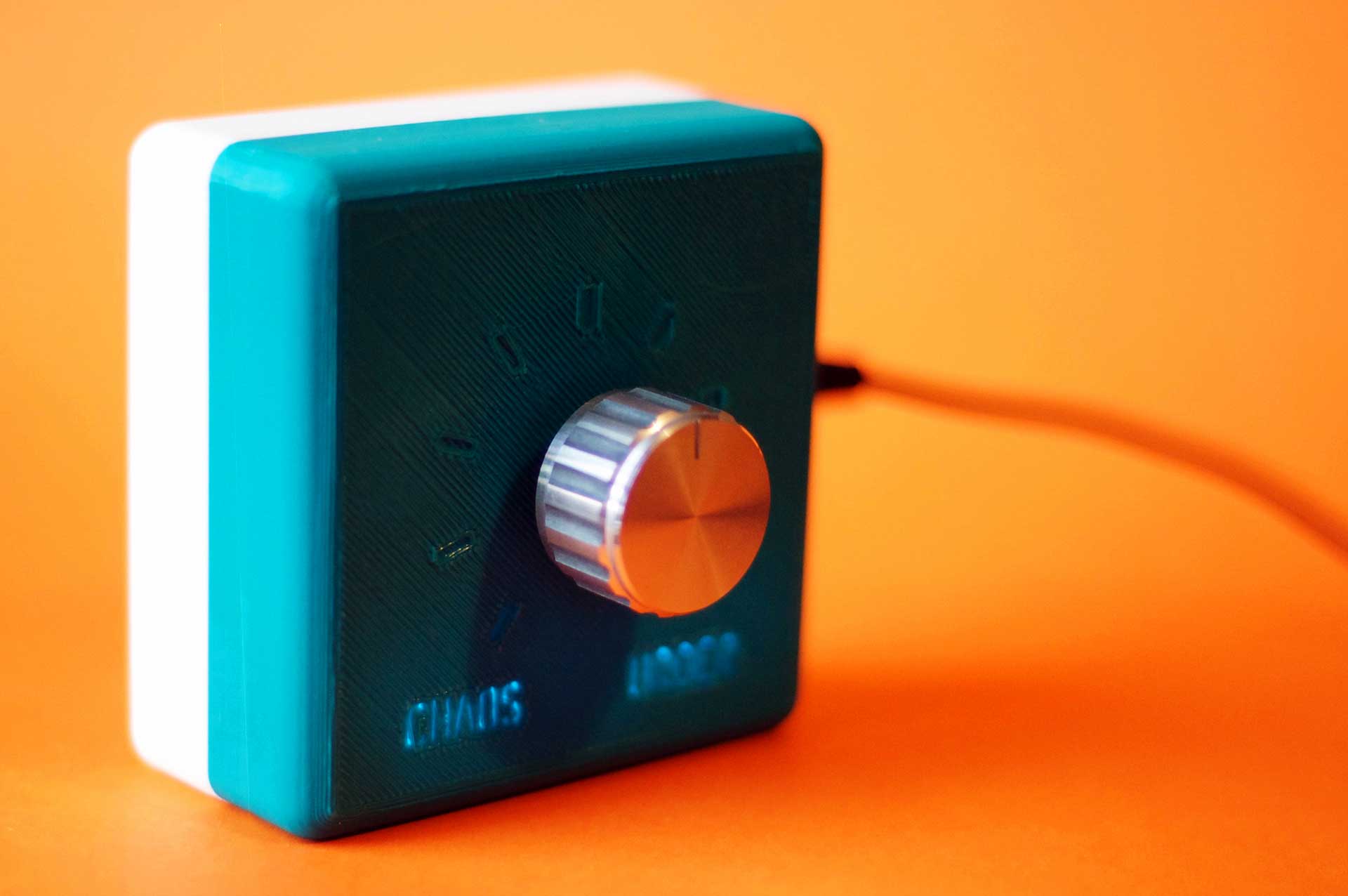 Connected to a projector, turning the control influenced the constantly flowing lines being projected at the venue. Turn it towards chaos and the lines created a more chaotic, but still visually appealing composition. Turn the control towards order and the lines began to follow a more grid like pattern.