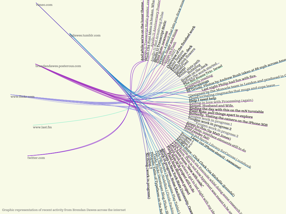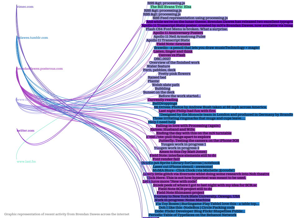 As part of a previous version of brendandawes.com, the homepage featured various data visualisations that flipped between showing an aggregated view of the different feeds I have out there on the web, as well as a circular exploration of the content taken from my previous Wordpress powered site.