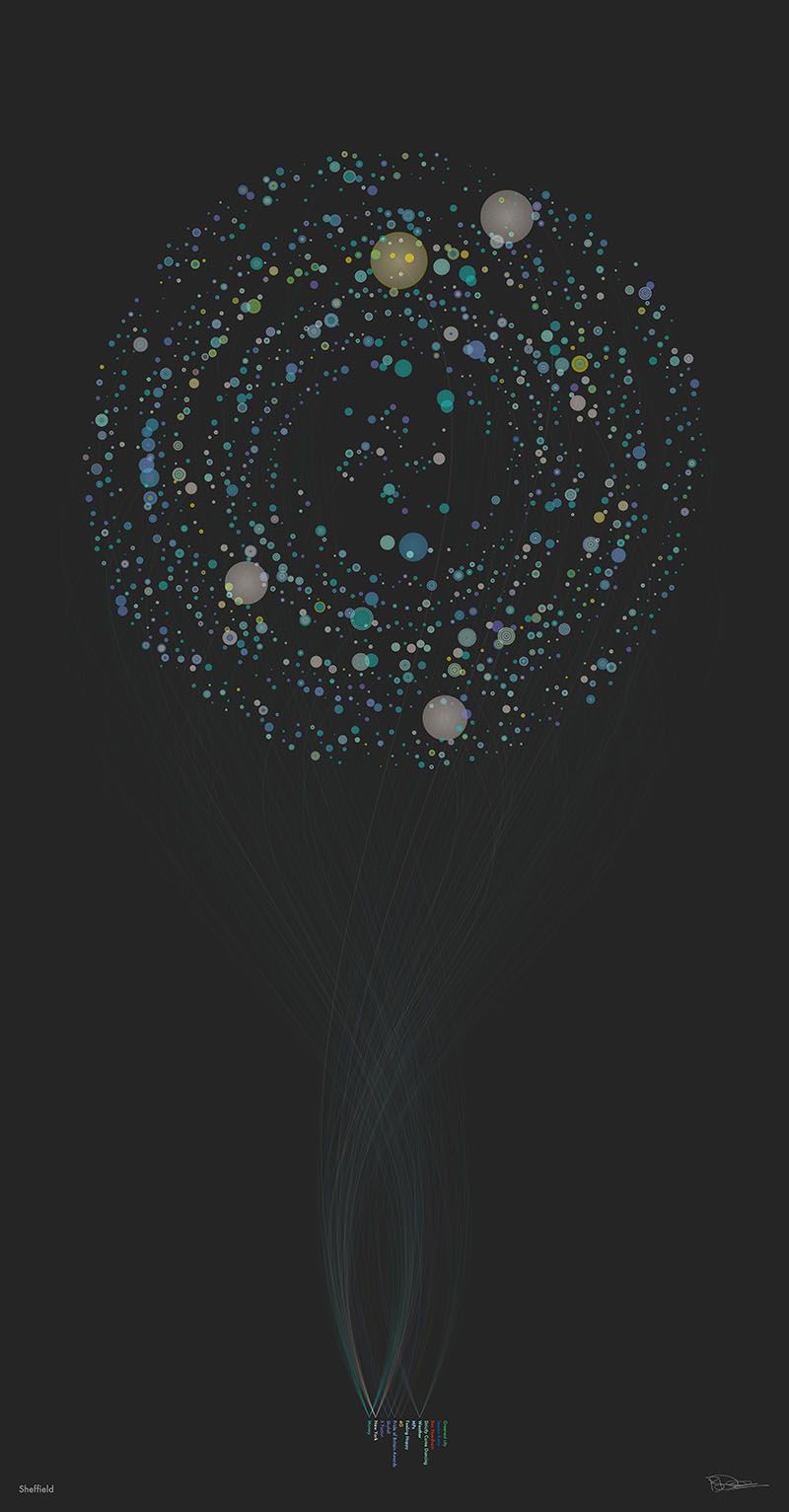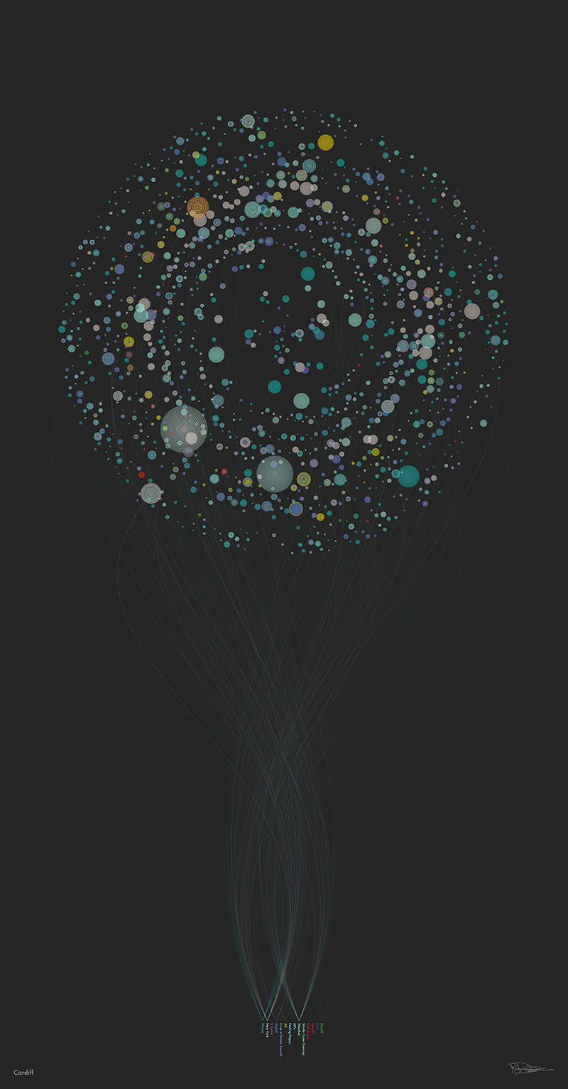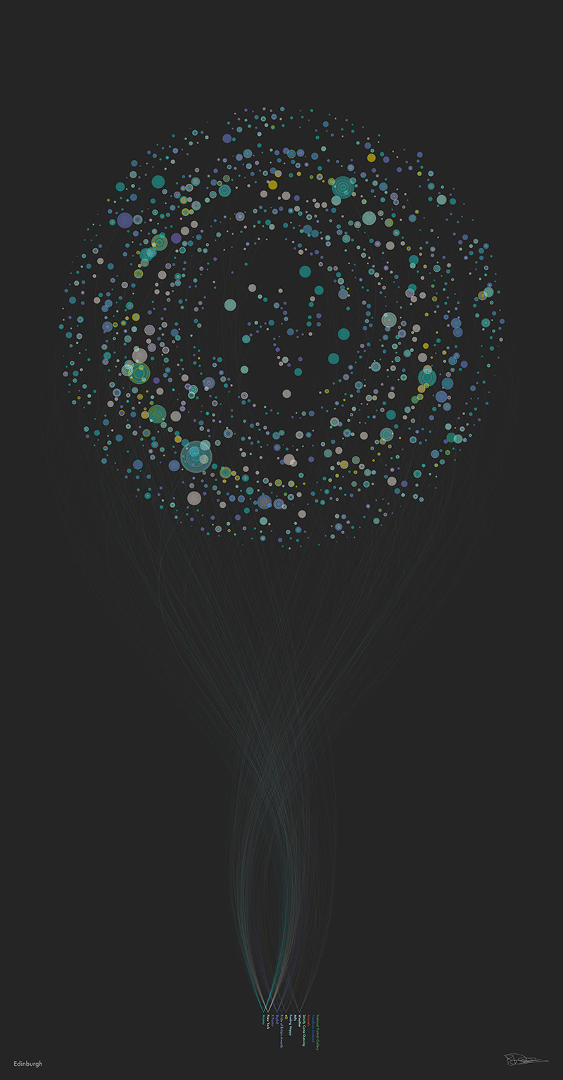 For the launch of 4G services in eleven UK cities, a commission from EE to create a digital portrait for each city formed from millions of bits of data as people talked and interacted about the biggest events of the day.