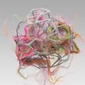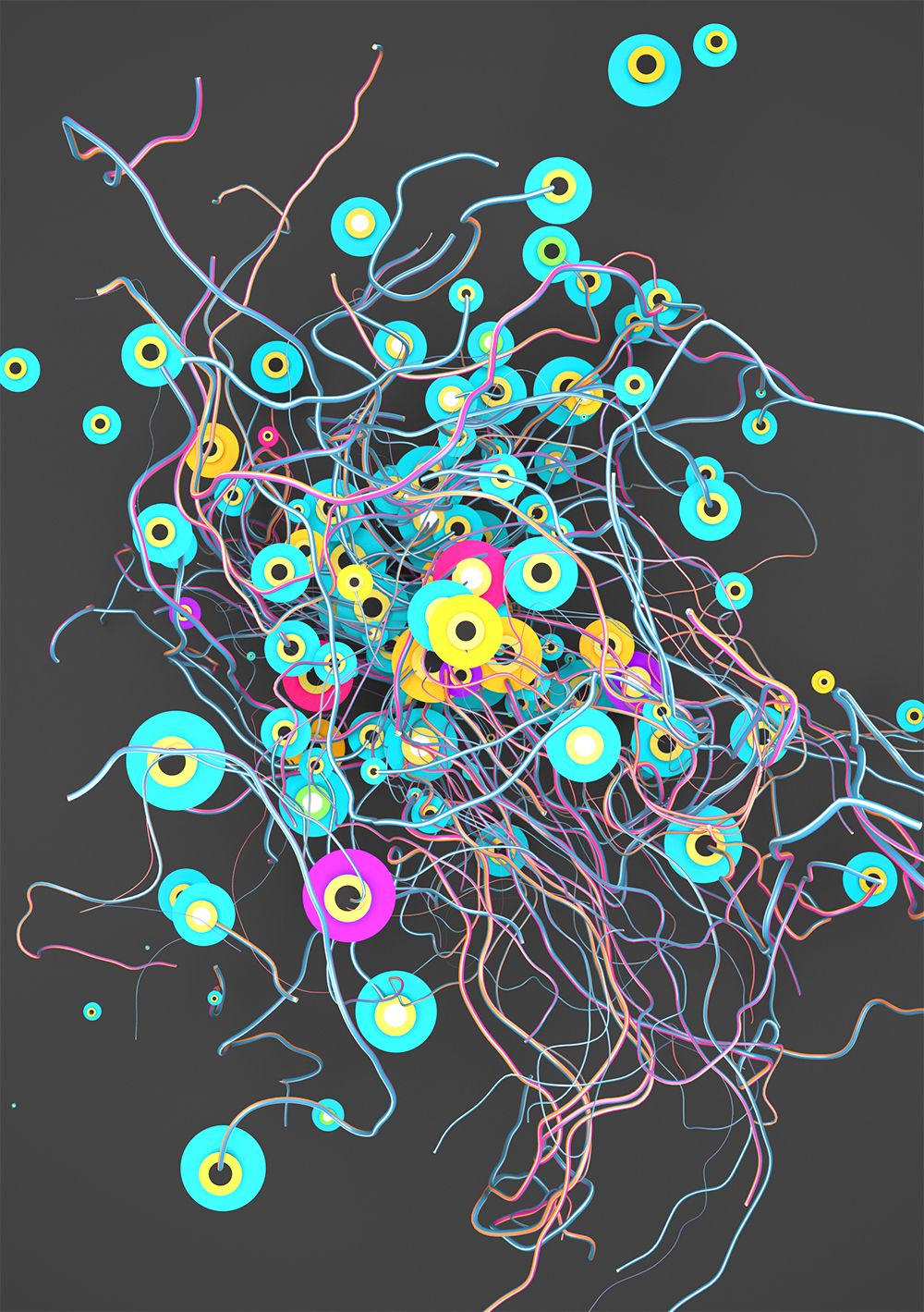 After several iterations, the final image, created in Houdini, used a series of three concentric disks. The larger out disk represented on of the four countries attendees came from — mostly Germany but also included Austria, Switzerland and Ireland. The middle disk represented if they were vegetarian or not — green if they were. The smallest disk was black for male and white for female. Intertwined within all this are branch like structures, inspired by the surrounding forest, but also to represent the connections that are made at these type of conferences.