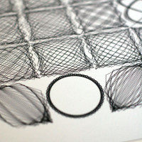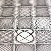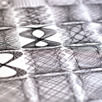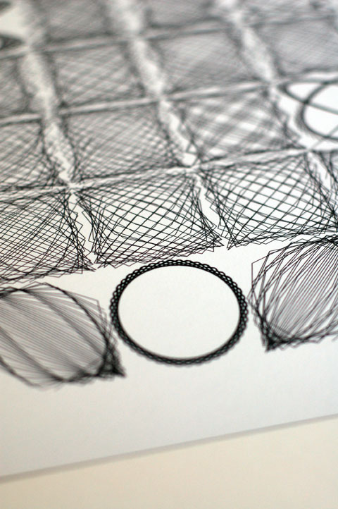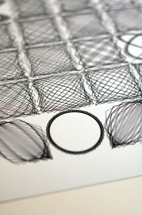 Based on the visual used in my talk for TedX Manchester in 2012 and limited to 50 prints, the image shows 54 Lissajous curves with each curve only separated programatically by a factor of one. For the most part the curves look very similar as they iterate from the top and then left to right; but occasionally and suddenly – amongst the seemingly average forms – leaps beautifully unexpected shapes.