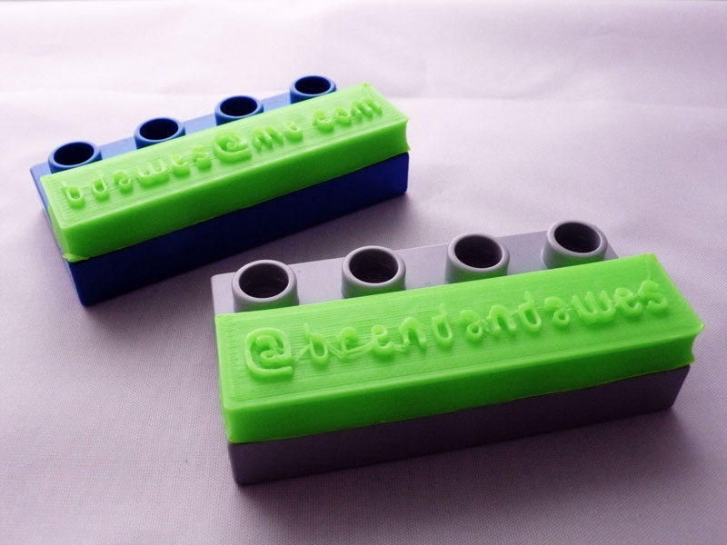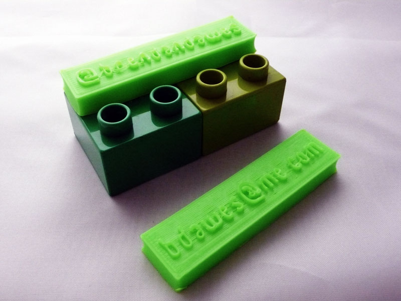The system uses preexisting Duplo bricks as a base for the Duplo compatible plastic fascias that can be hot-swapped depending on the context. I might not always want to give my mobile number out or I might just want to give someone my Twitter address.
