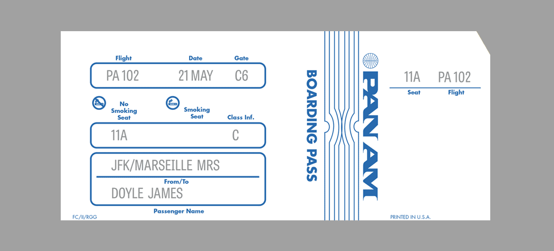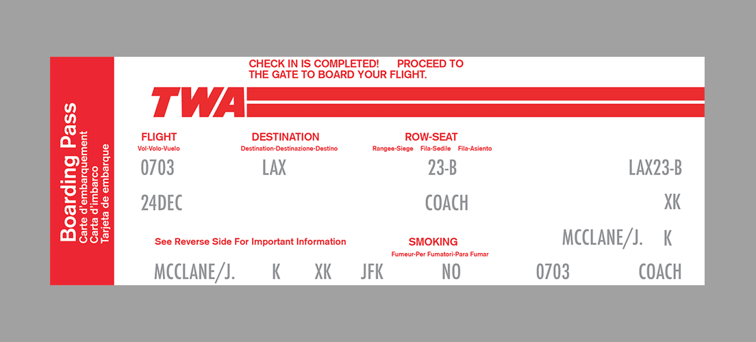 Now Boarding takes that idea and creates airline passenger tickets for some of films' most legendary characters. As John McClane travelled from New York to Los Angeles he had no idea of the events that would unfold in the following hours. His airline ticket is in eventuality his ticket for the adventure that was about to take place.