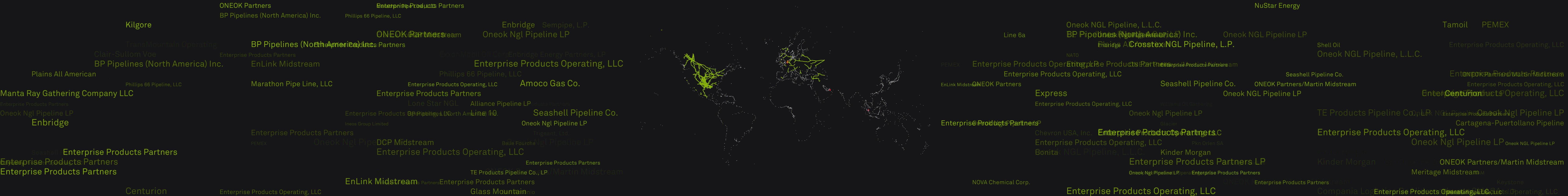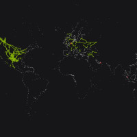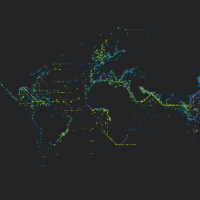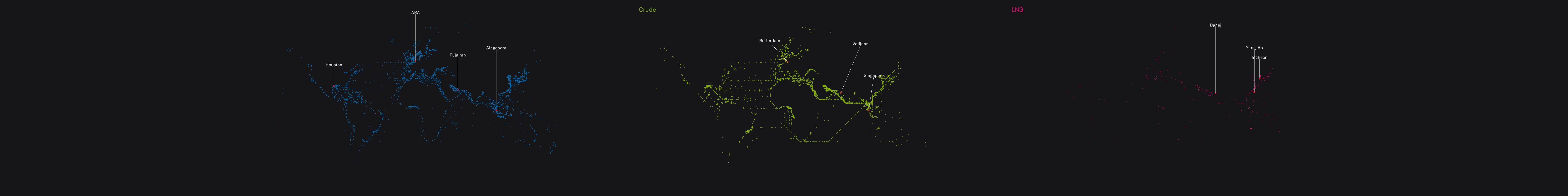 Probably my favourite parts of this project were the happy accidents that appeared as I started to play around visualising the data. Firstly there is no map displayed at any point. Instead the map of the world is creatad entirely by the small dots making up each of the ports around the world. Secondly, as I was working on a land avoidance system that the ships could follow, I created a kind of "crow flies" visualisation of various types of shipping routes, something that I thought the client wouldn't be into. As it turned out they loved these crow-flies interpretaions of their data, so much so that these graphics were used as the visual for the official invite to experience the visualisation during the oil forum event.