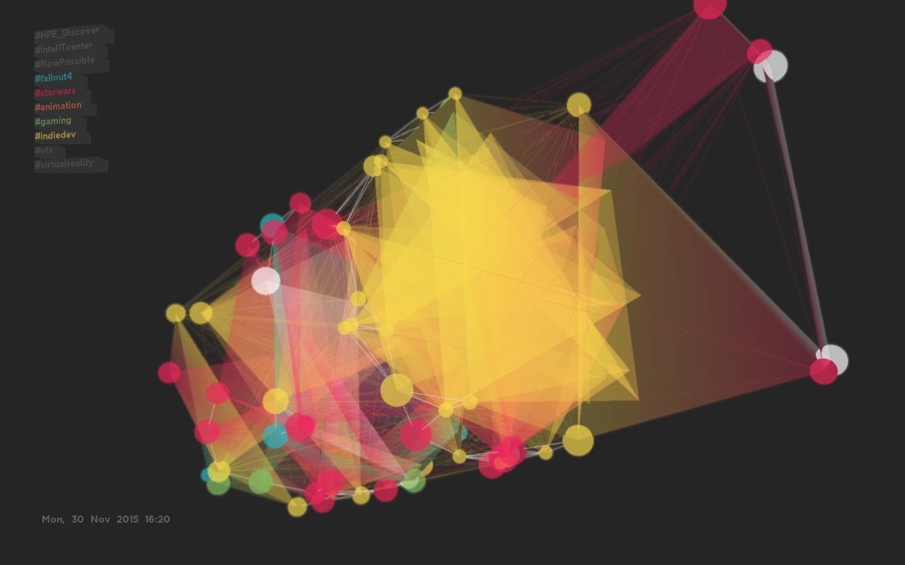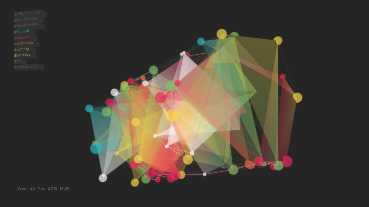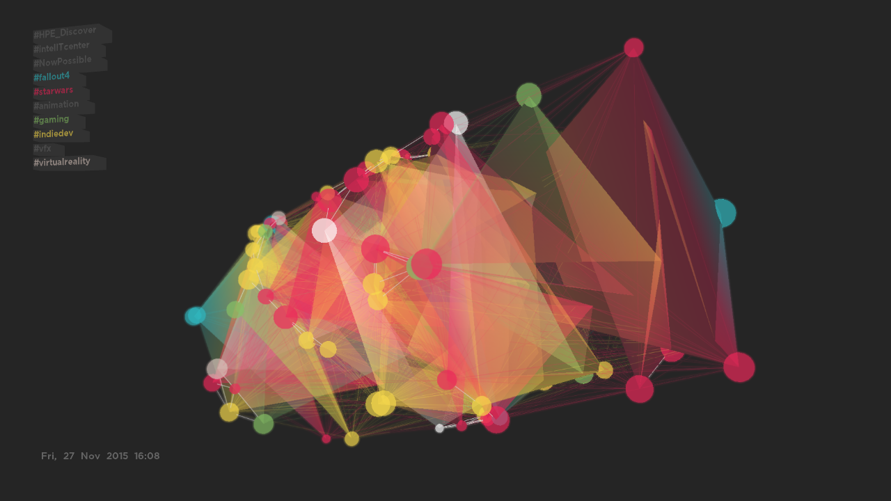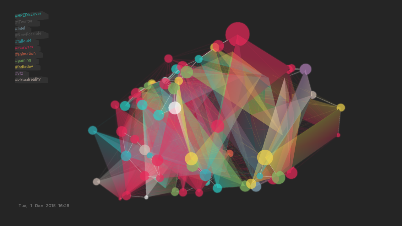 Commissioned by Escape Technology for Intel for the HP Discover event in London, The Shape of Data takes the real-time happenings on Twitter and for every minute, creates a physical like structure for that moment representing the popularity over time of selected hashtags. At the start of each capture, text accompanies each moment. Then, as time passes, the text becomes less important as the expected transforms into the unexpected, giving form to these passing moments.